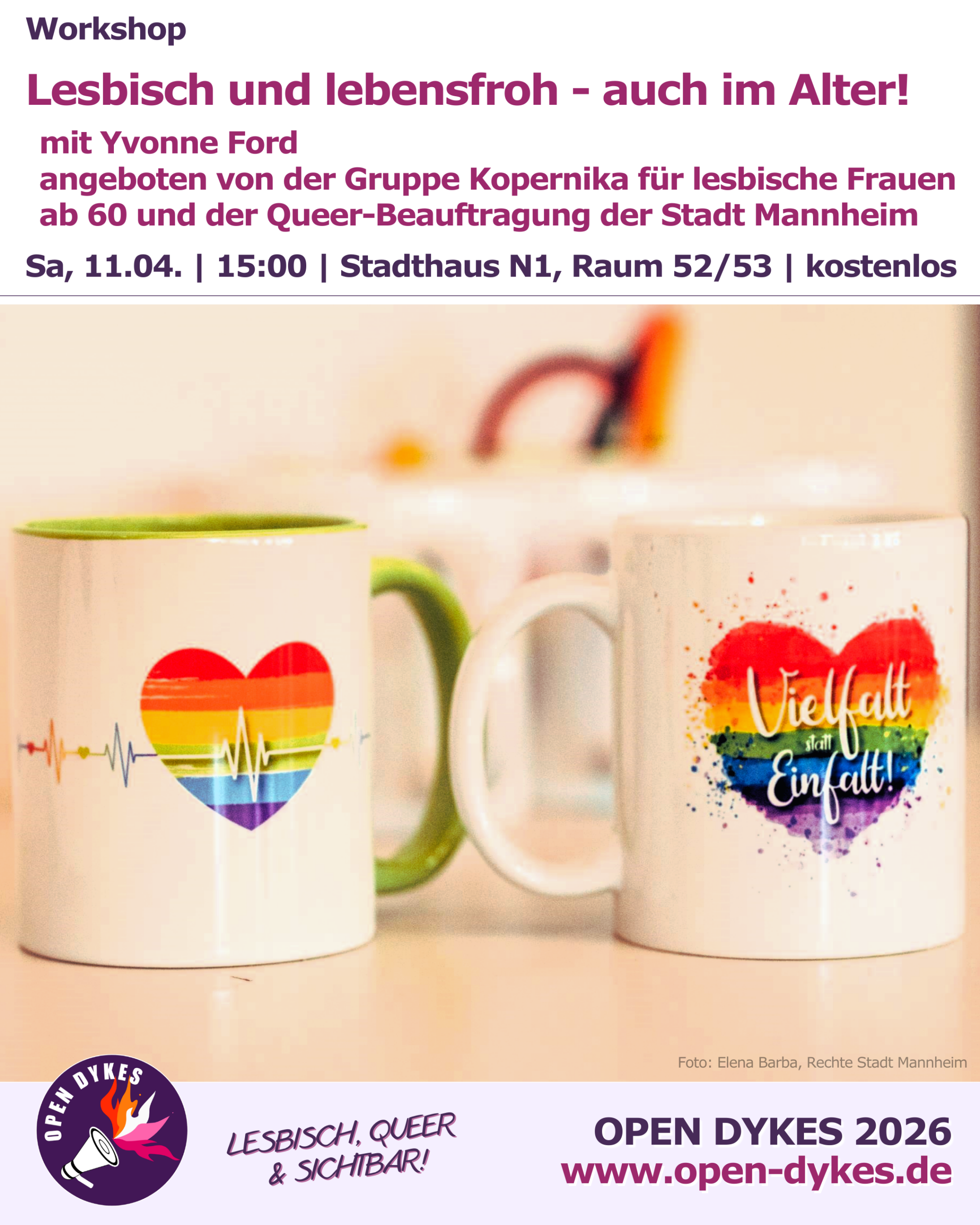 Der Eintritt ist frei. Der Workshop wird angeboten von der Gruppe Kopernika, lesbische Frauen ab 60 Jahren, und der Queer-Beauftragung der Stadt Mannheim. Er findet statt im Rahmen von Open Dykes, dem Lesben und FINTA*-Festival Rhein-Neckar.